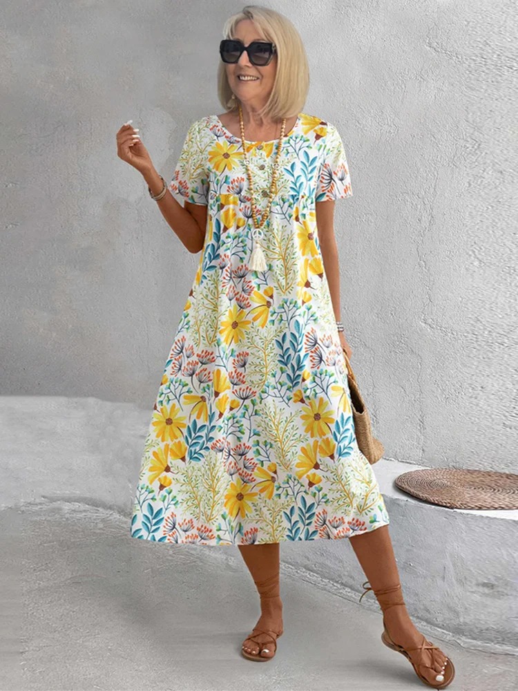 Bohemian Floral Print Half Sleeve V-neck Mid-Length Dress