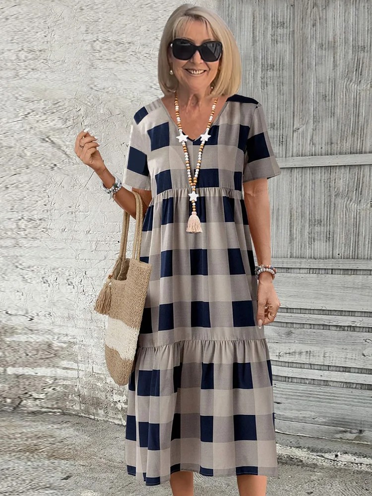 Vacation DRESS EMERY Plaid Gingham Print V-Neck Ruffle Hem Bishop Sleeve Elegant Pleated Dress Women's Short Sleeve Plaid Dress