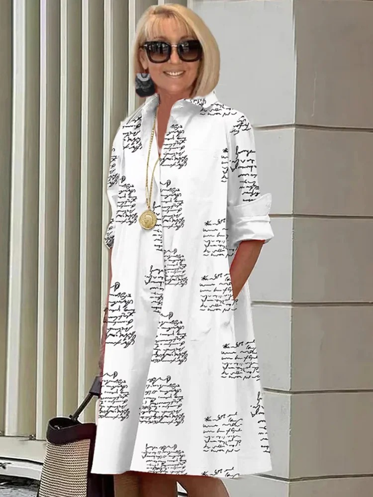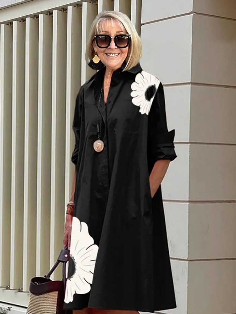 Shirt Collar Long Sleeve Pocket Mid-Length DressPrinted Shirt Collar Long Sleeve Pocket Mid-Length Dress
