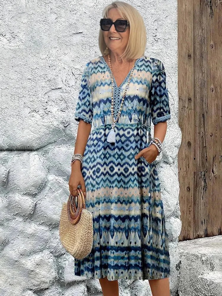 Half Sleeve Floral Print Summer Fall V Neck Casual Geometric Printed Dress