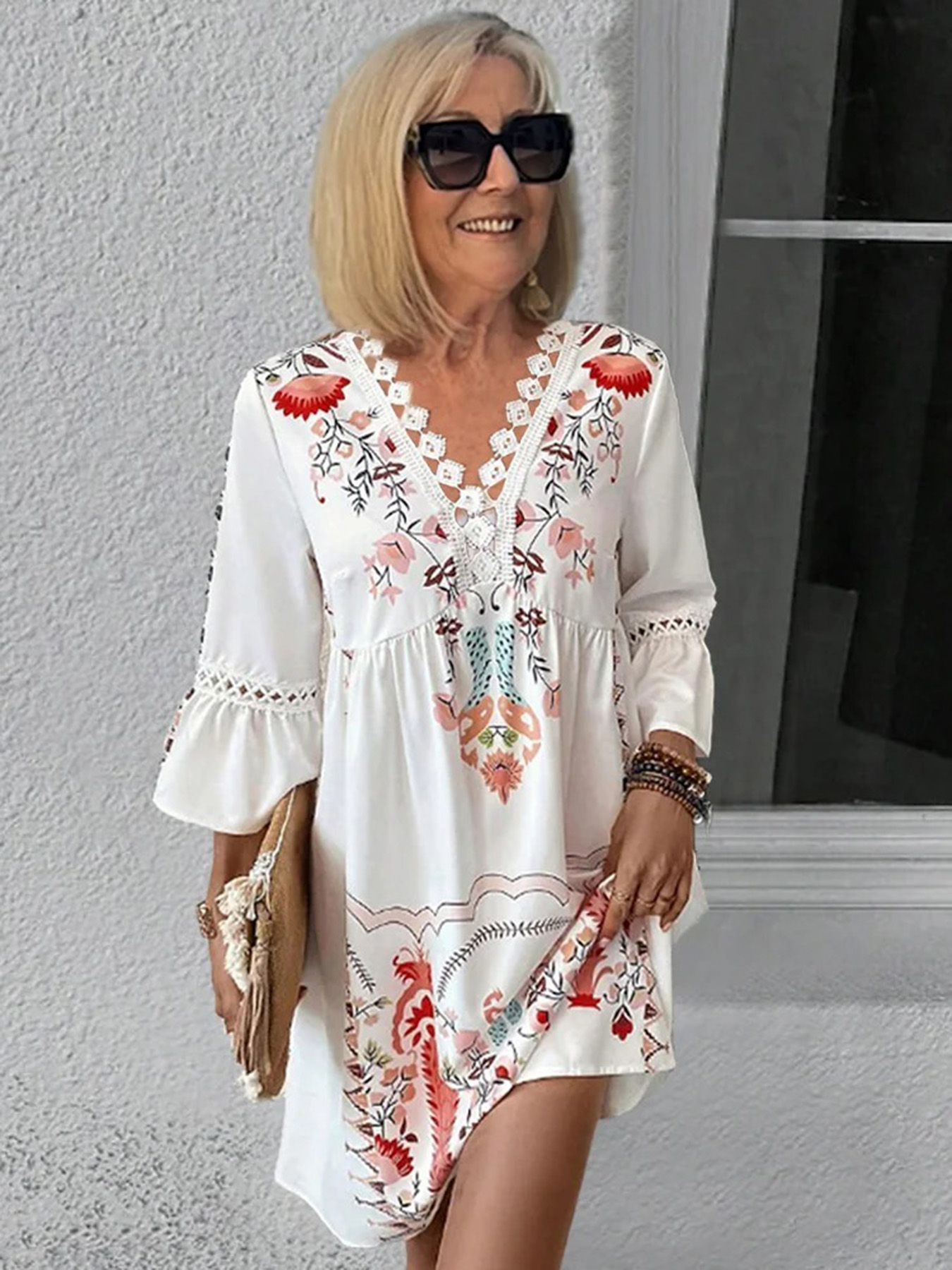 V-neck Printed Lace Stitching Bohemian Casual Vacation Style Dress