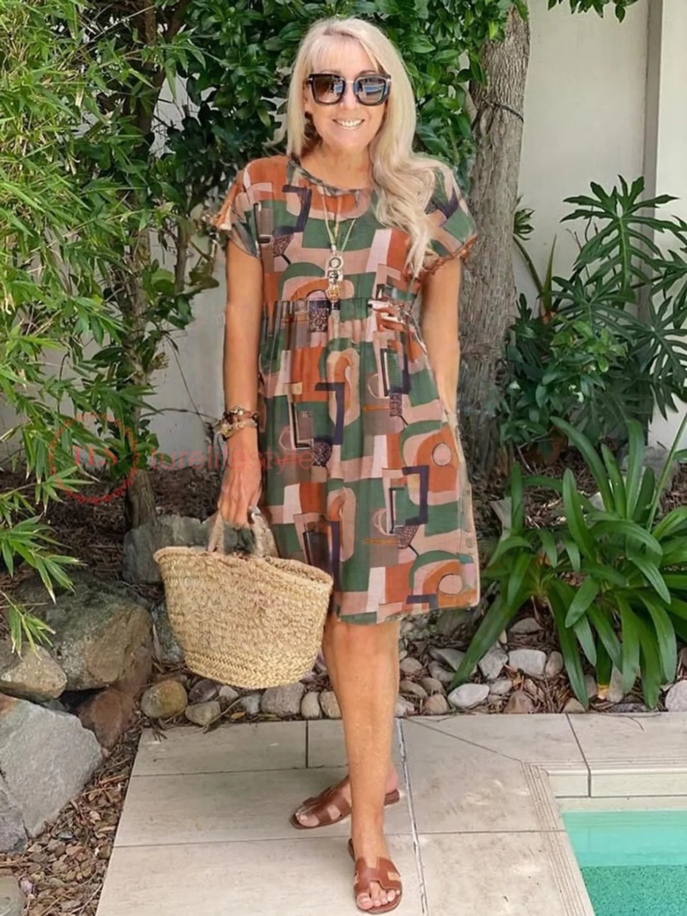 1pc Women'S Summer Vacation Geometric-Patterned Polyester Tunic Dress with Ruffle Detail, Crew Neck, Batwing Short Sleeves, Knee-Length - Woven Fabric