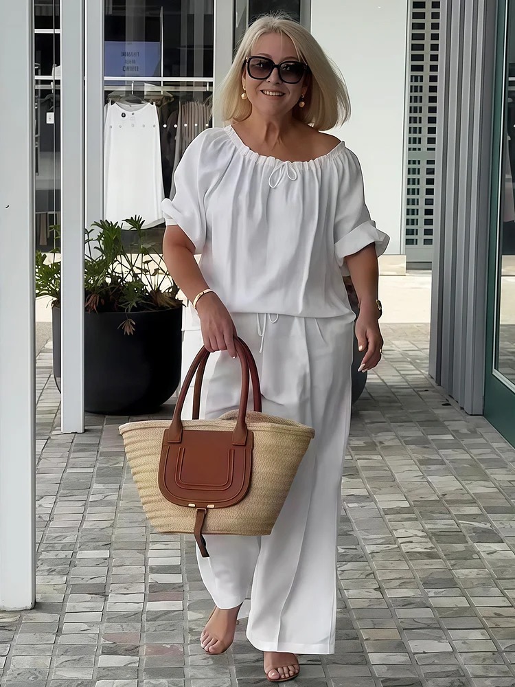 Off-the-shoulder Ruffle Edge Neckline Casual Vacation Cotton and Linen Trousers Set
