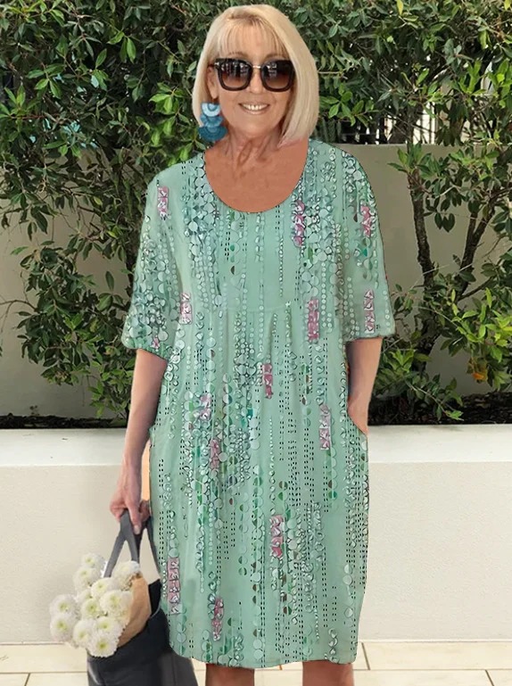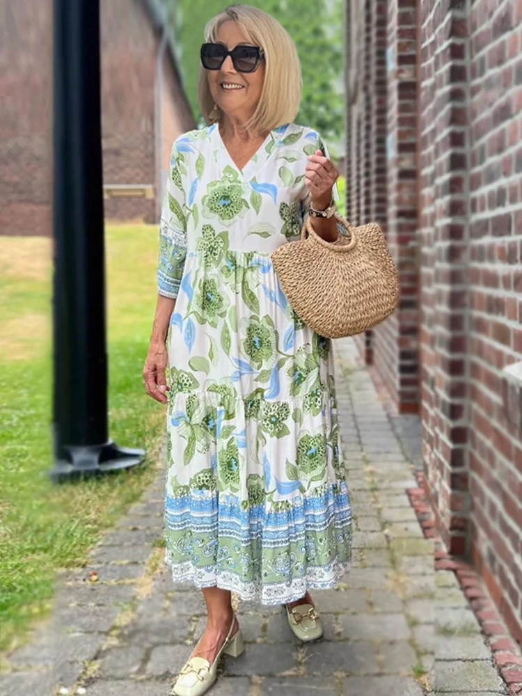 Women's Crushed Flower Printing V-Neck Medium and Long Dress Short Sleeve Dress