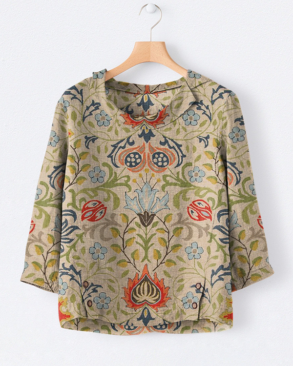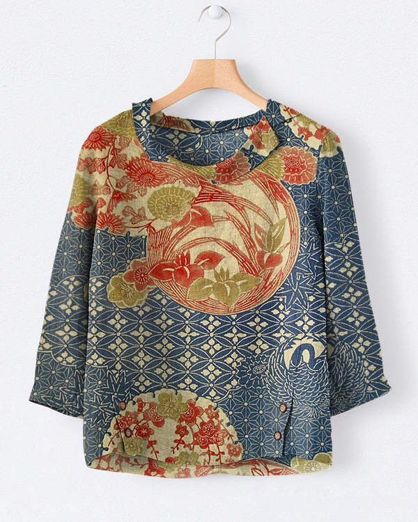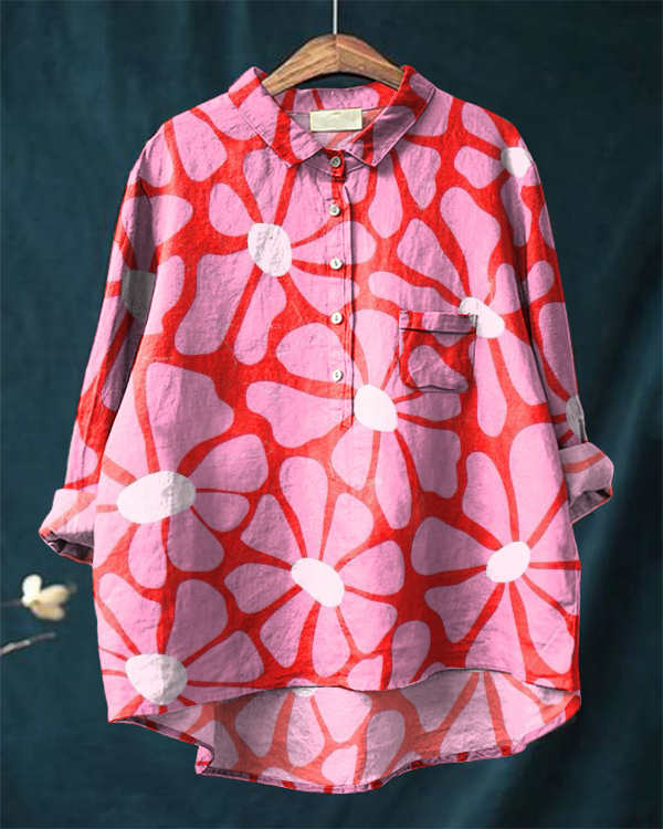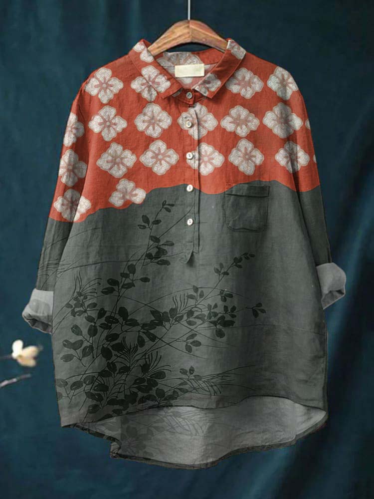 Women's Vintage Flower Art Print Casual Cotton And Linen Shirt