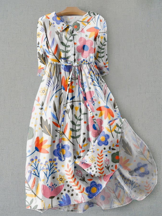 Literary Casual Floral Print Tie Loose Dress
