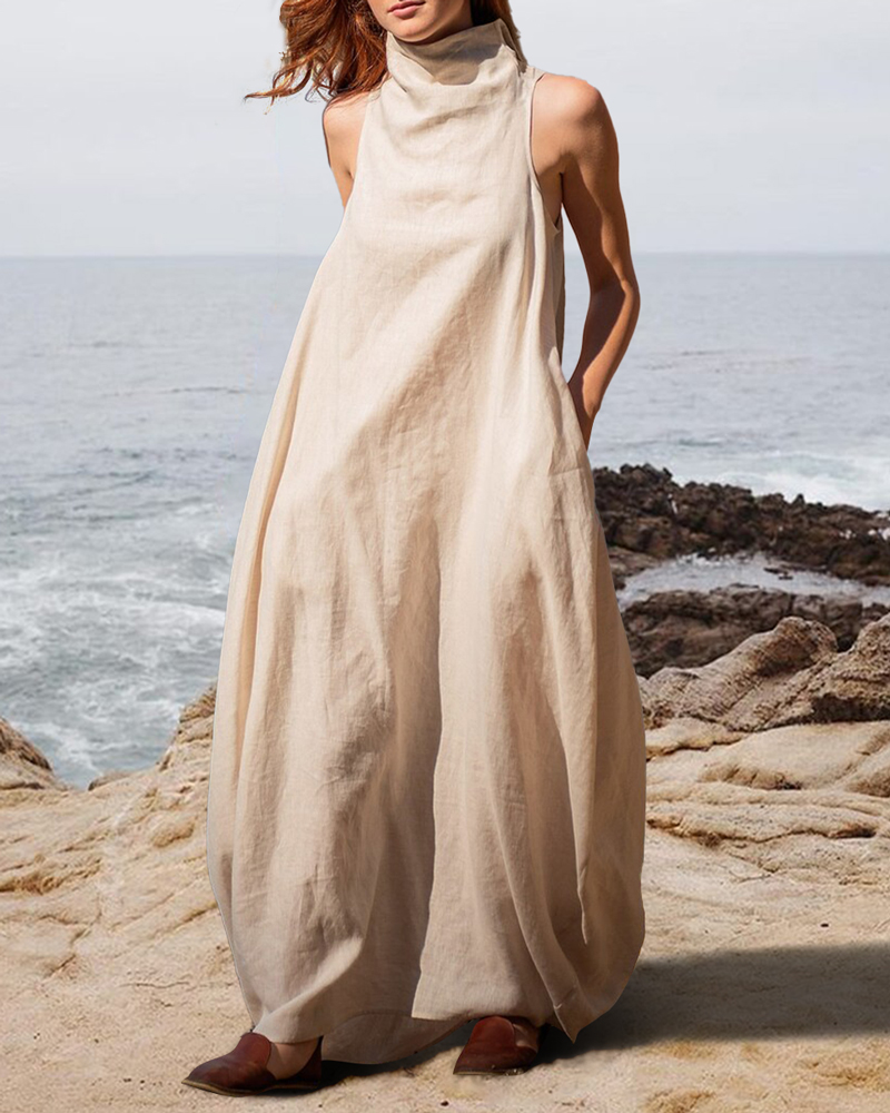 Stand Collar With Back Crinkle Linen Maxi Dress