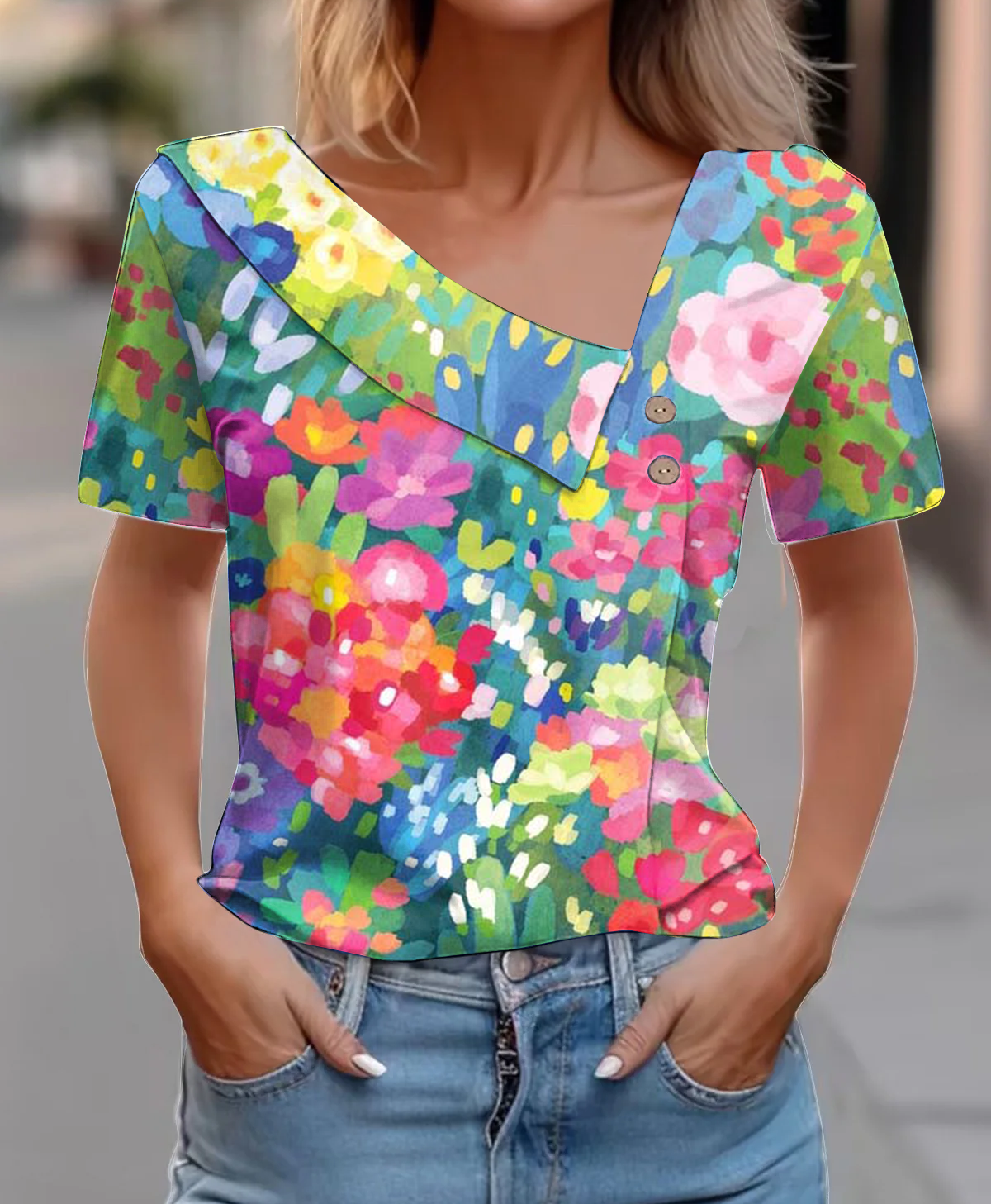 Vintage Colored Floral Cotton Blend Short Sleeve Top