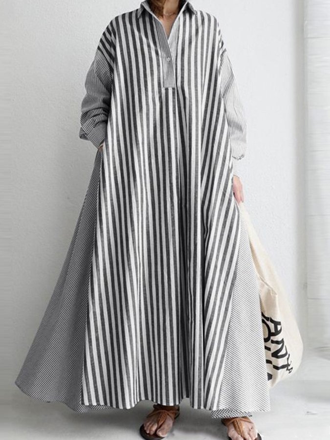 Women's V-Neck Long Sleeve Striped Shirt Dress
