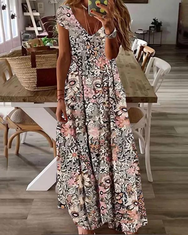 Short Sleeve V-Neck Print Maxi Dress