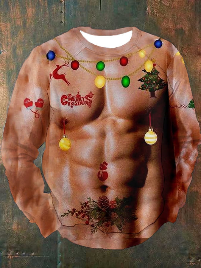 Mens Hairy Chest Tattoo Light Bulb Novelty Party Christmas Ugly Print Raglan Sleeve Sweatshirt