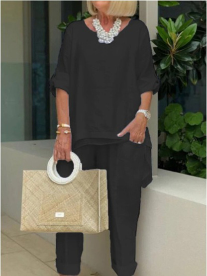 Double-layered Solid Color Cotton and Linen Two-piece Loose Casual Soft Shirt Pants