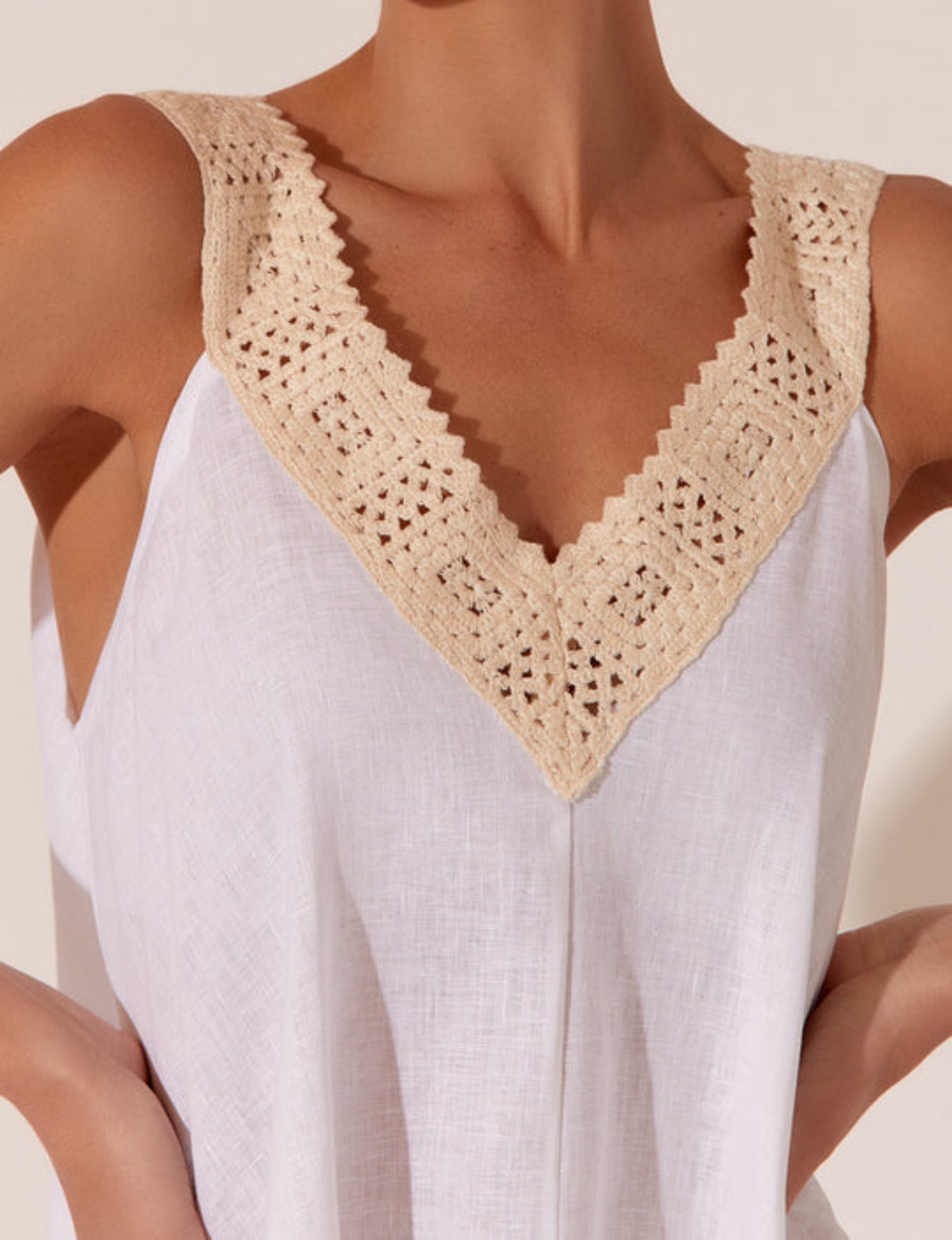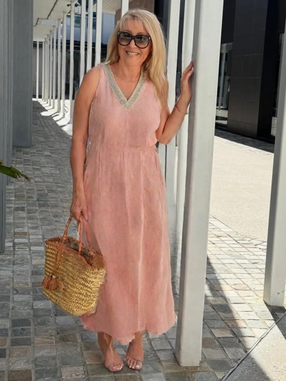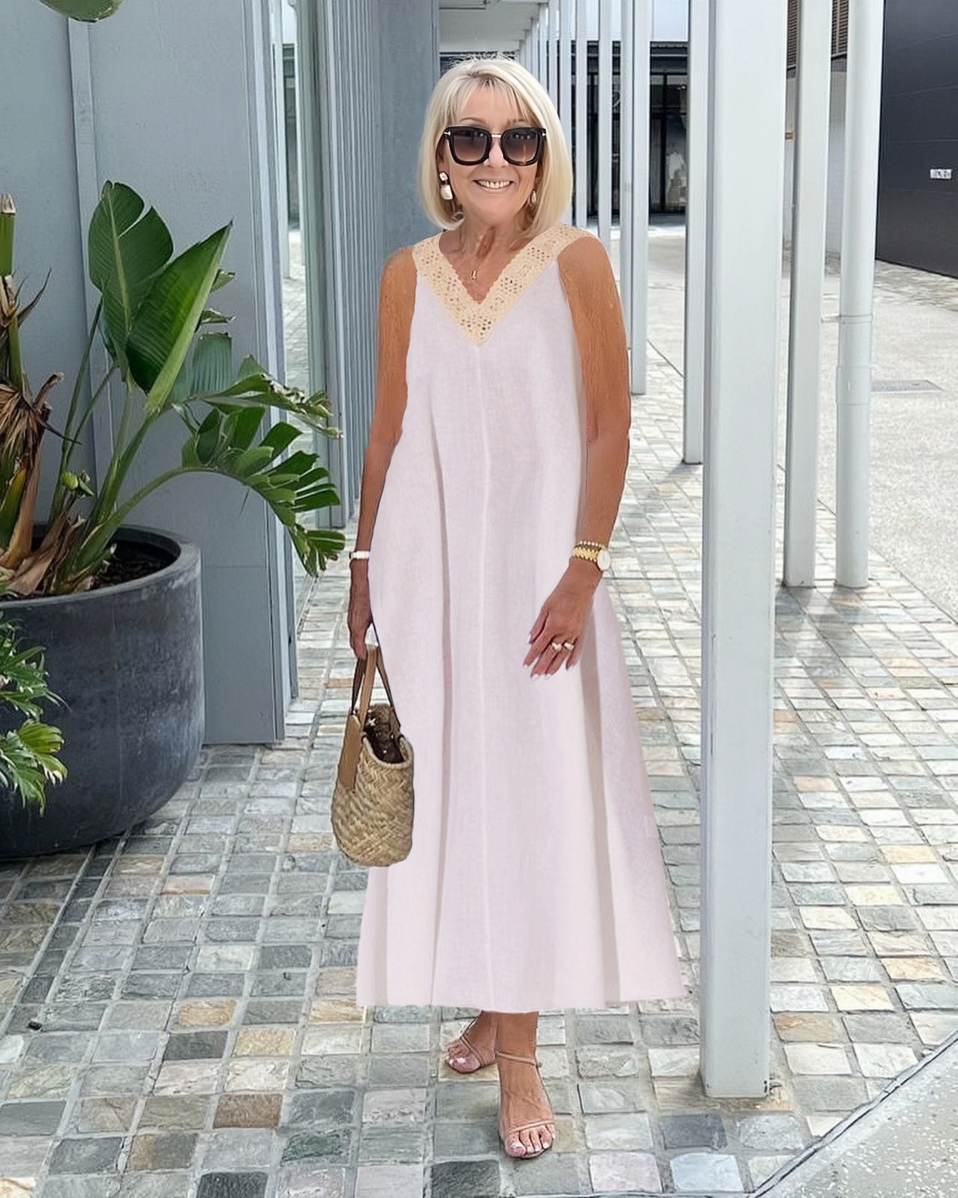 Dress length: length dressCollar type: v-neckPopular elements: lace stitchingFabric name: cotton and linenStyle type: ElegantSleeve length: sleeveless