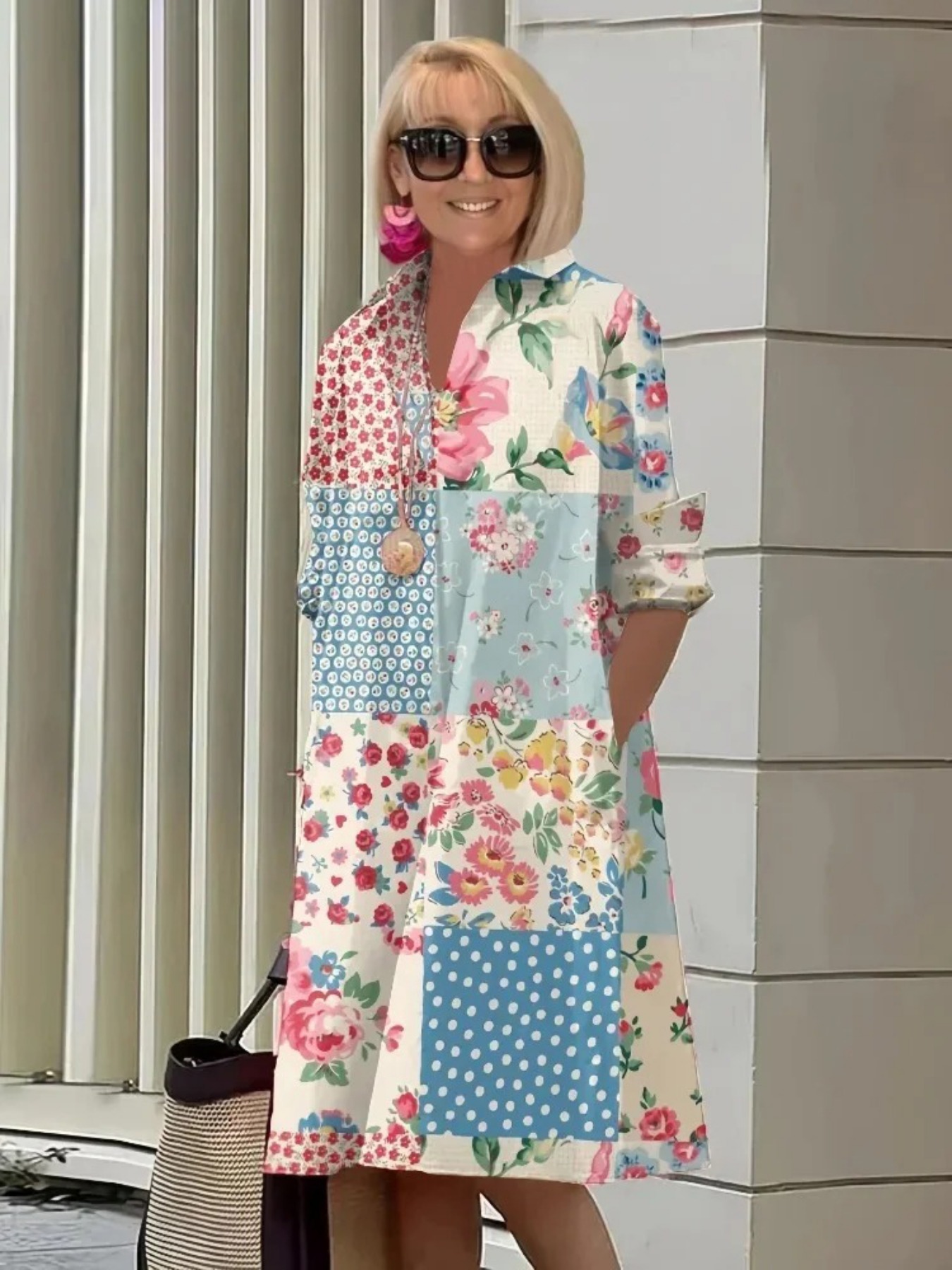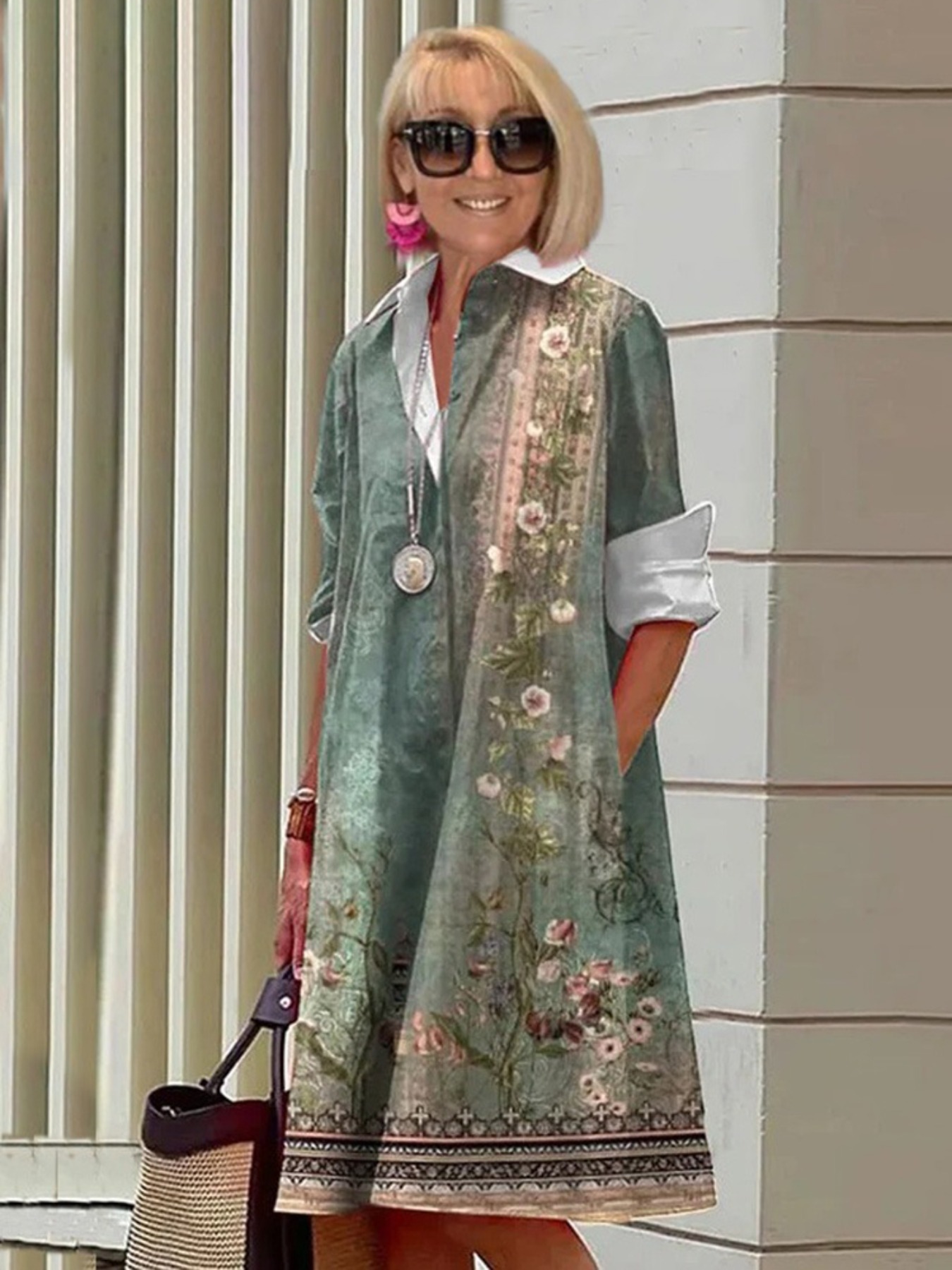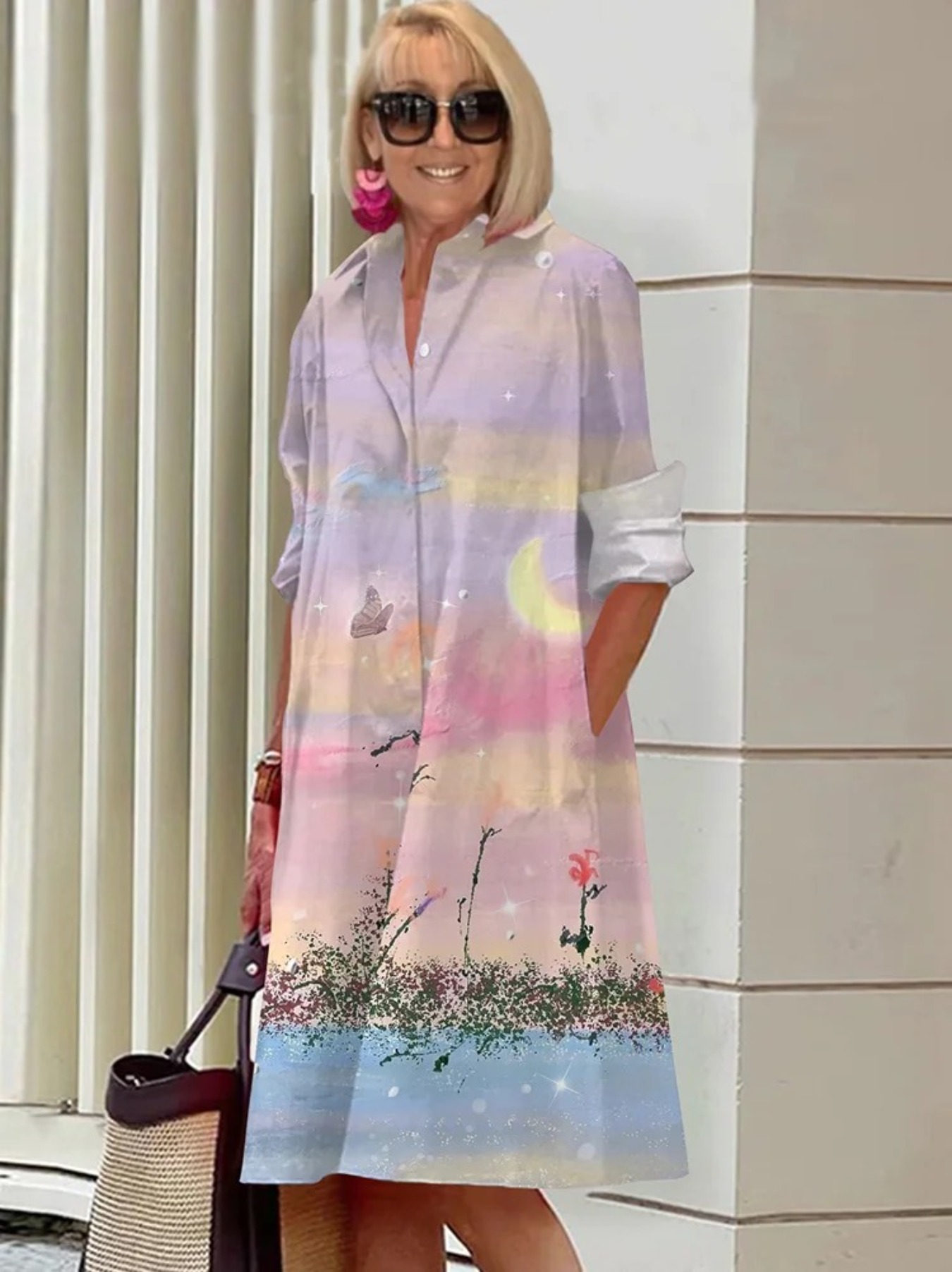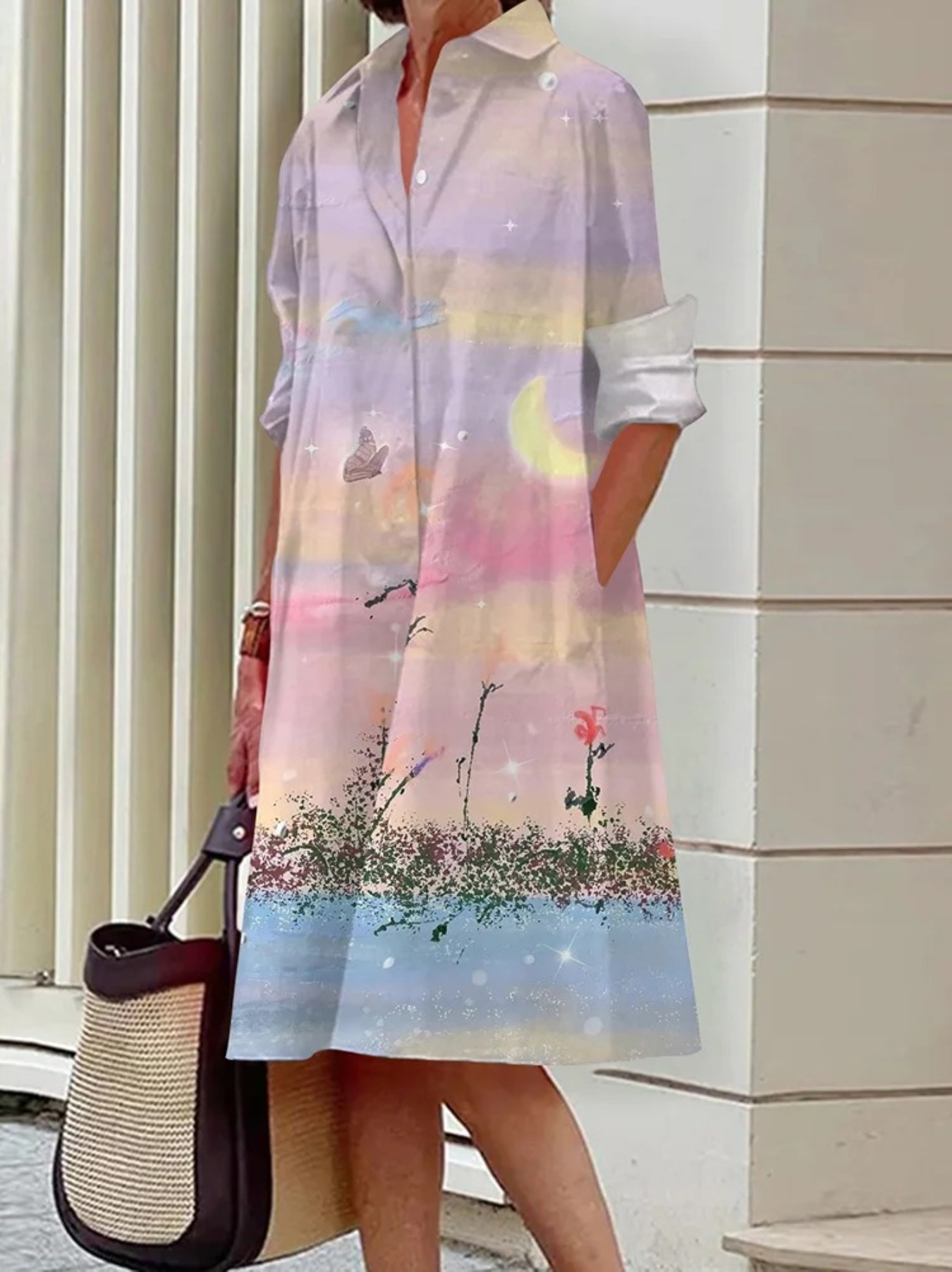 Pink Printed Casual Long Sleeve Pocket Shirt Dress