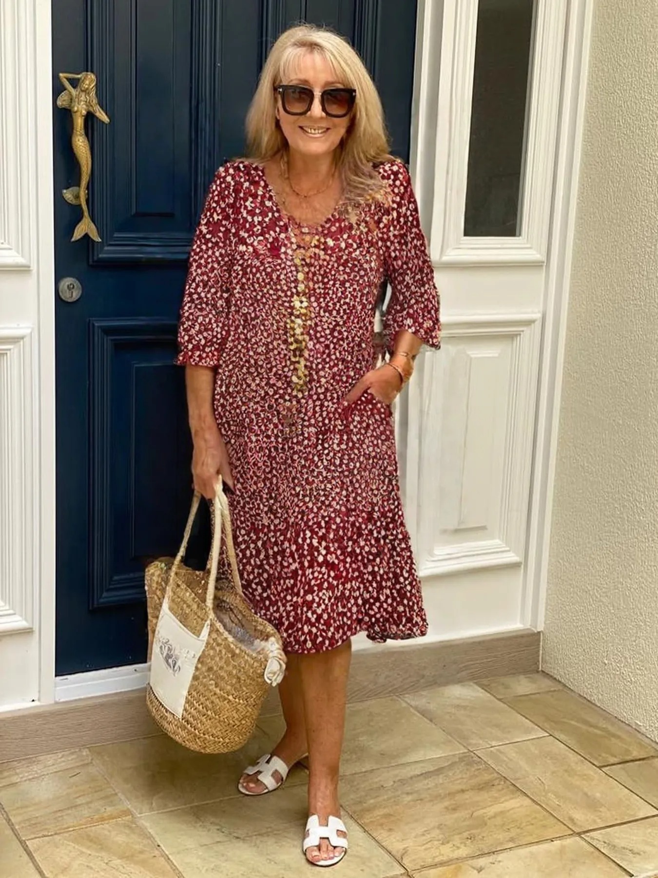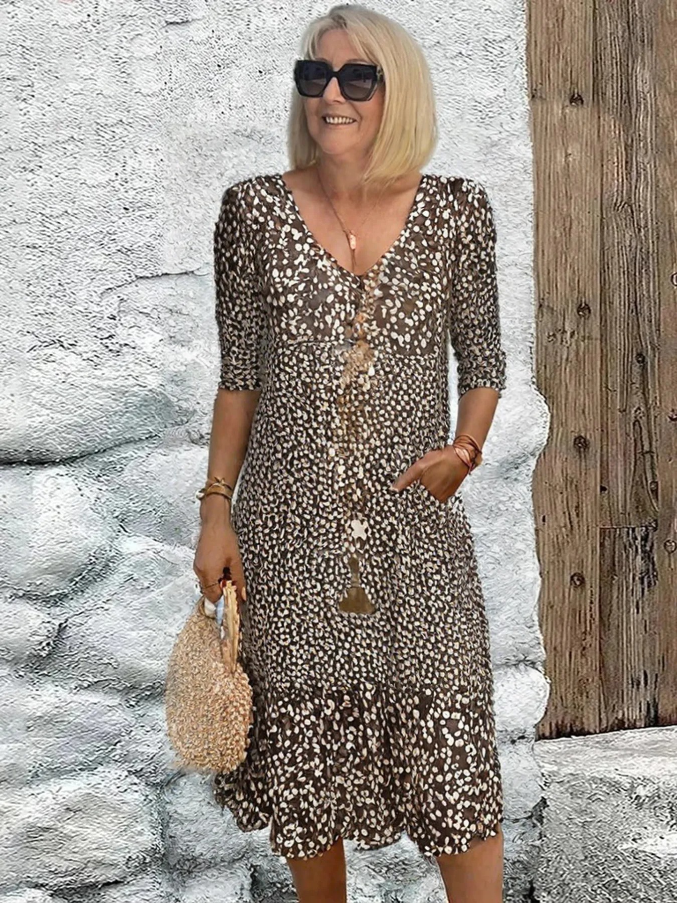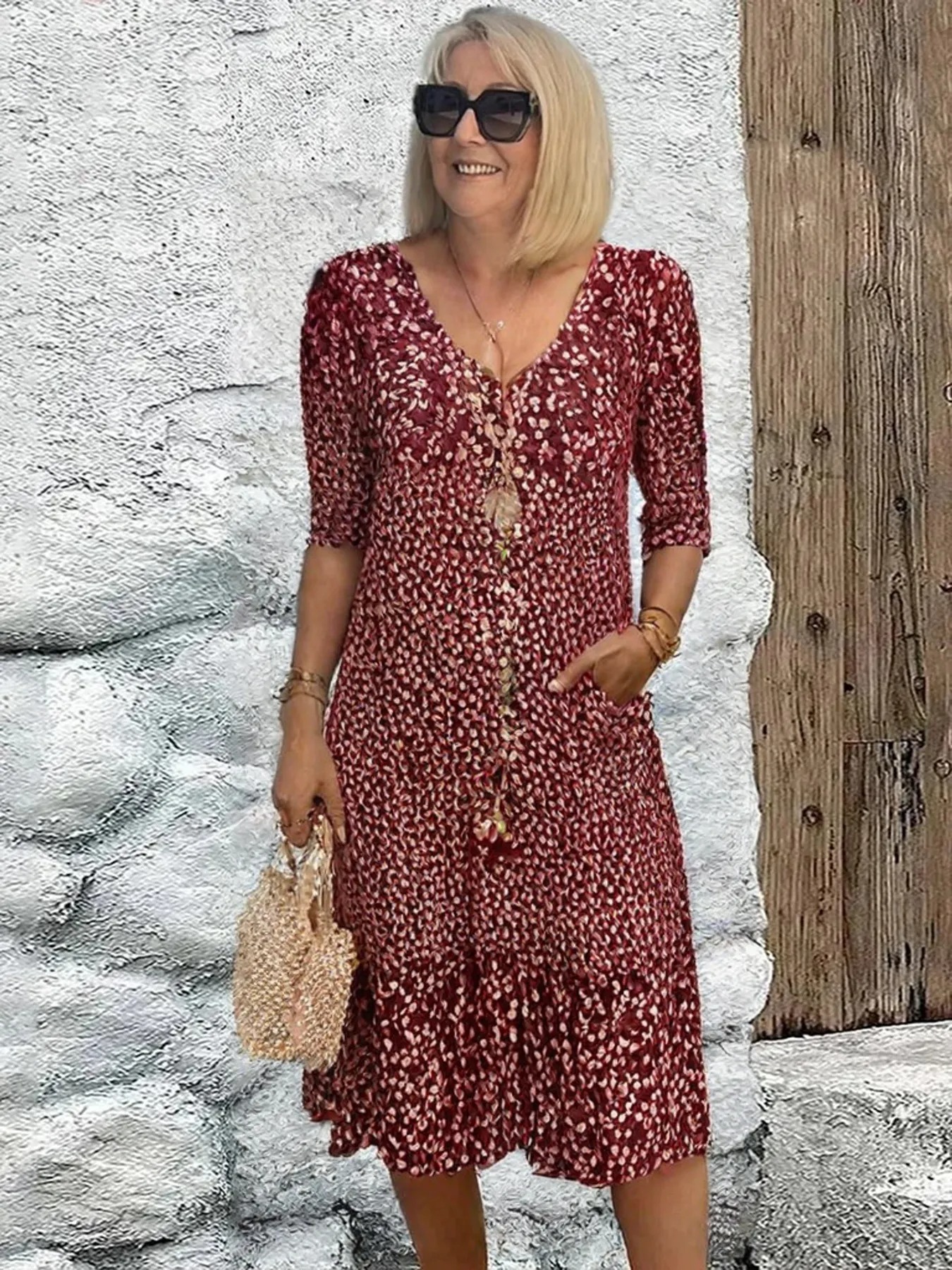 Pattern: small floral printSkirt type: princess skirtWaist: mid-waistSkirt length: mid-length skirtNeckline: V-neckMaterial Name: Cotton BlendSleeve Type:Regular SleeveSleeve Length:Seven Split SleeveSkirt Category: DressCraftsmanship:Printing