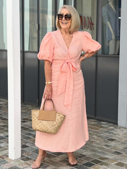I’m feeling very pretty and feminine today in this beautiful soft APRICOT linen dress.