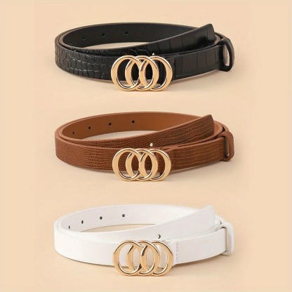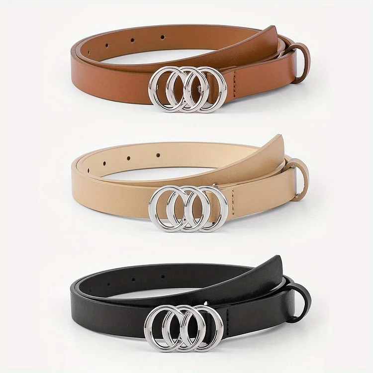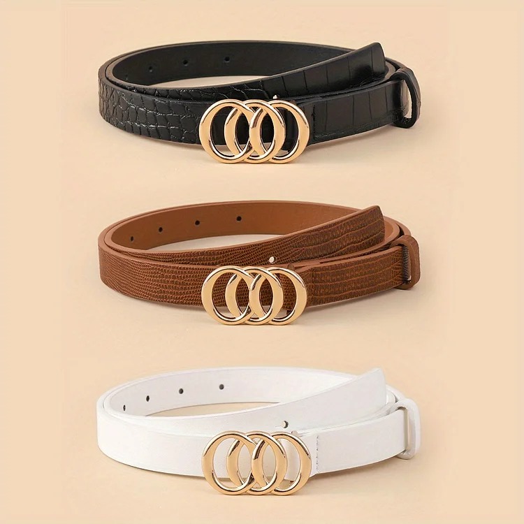 Versatile: can be worn with jeans, pants, shorts, and dresses Stylish 3 ring buckle design adds a trendy touch to any outfit Made of high-quality PU leather for durability and long-lasting use Comes in a set of 3 solid colors to match any style and occasion Adjustable size to fit most waist sizes comfortably
