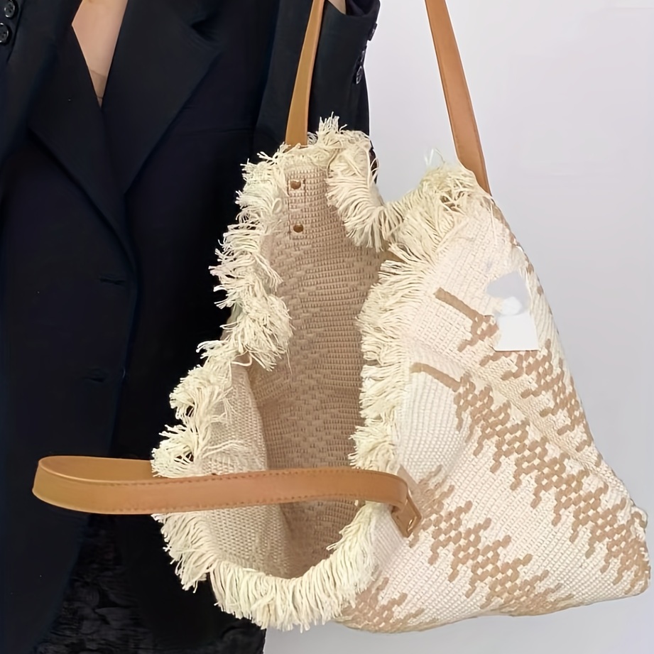 Straw Fringed Large Capacity Tote Bag, Lightweight Fashion Shoulder Bag, Exquisite Summer Beach Bag