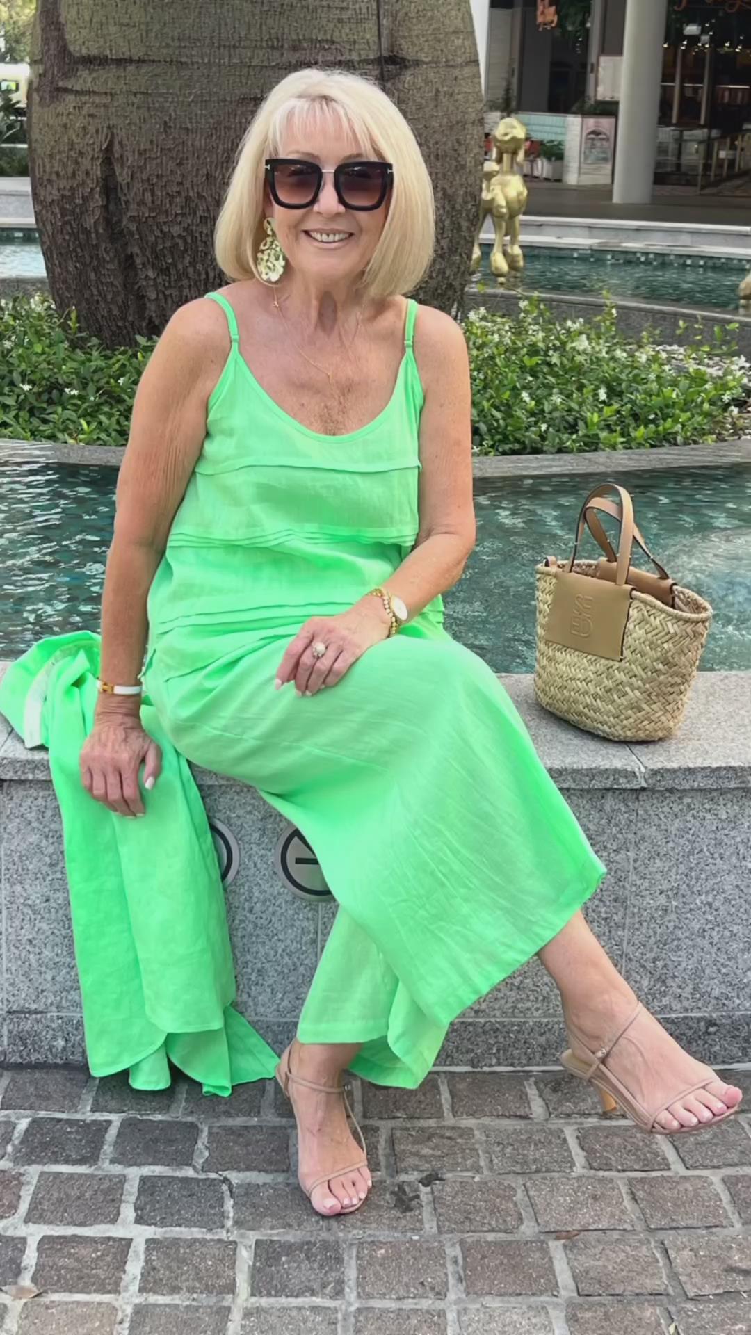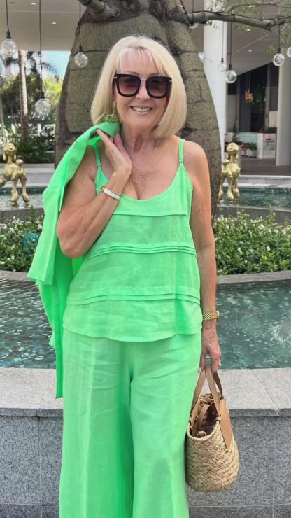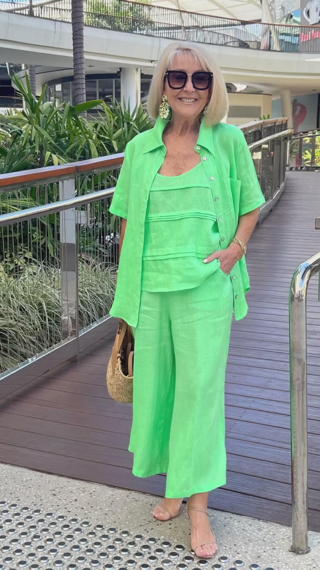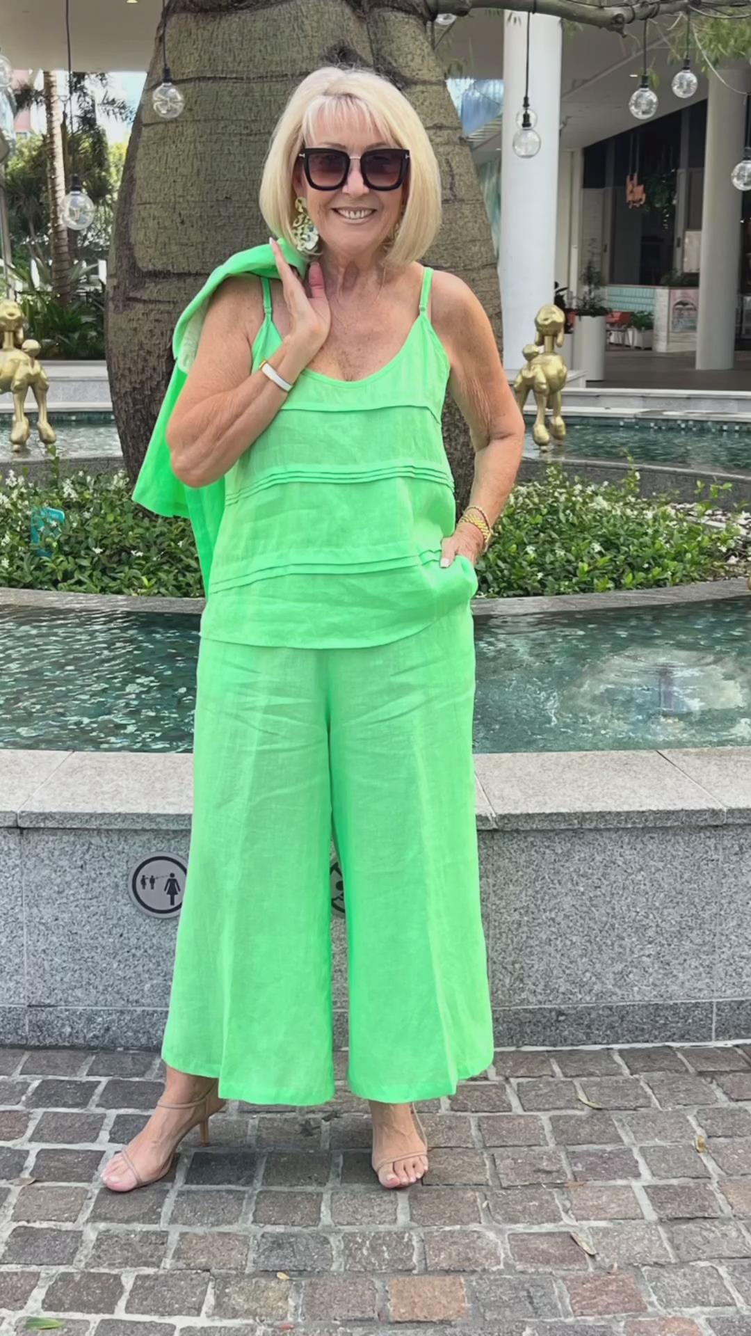 The Details: Composed of comfortable and breathable linen fabric and this summer's most popular color, glossy kiwi green, this suit features layered fine pleat detailing on the top for a vibrant summer hue. The pants are designed with an elasticized waist to accentuate your natural style, and the short-sleeved blouson jacket pairs perfectly to make you the center of attention no matter the occasion!