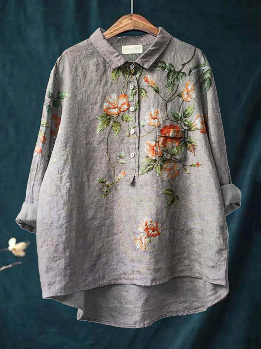 Women's Vintage Ethnic Floral Art Print Casual Cotton And Linen Shirt